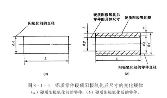 鋁及鋁合金表面上的硬質陽極氧化膜,具有較高的硬度和優良的耐磨性,是改善鋁質零件表面耐磨性的常用手段,為了提高零件的使用壽命,產品設計通常要求硬質陽極氧化膜層具有較大的厚度,因此,鋁質零件硬質陽極化以后,零件的最終尺寸變化就比較大,通常遵循這樣的規律,就是零件最終尺寸的增大值,大體上等于膜層厚度的1/2,如圖所示。該數值被廣泛用于估算鋁質零件硬質陽極化以后尺寸的變化規律。